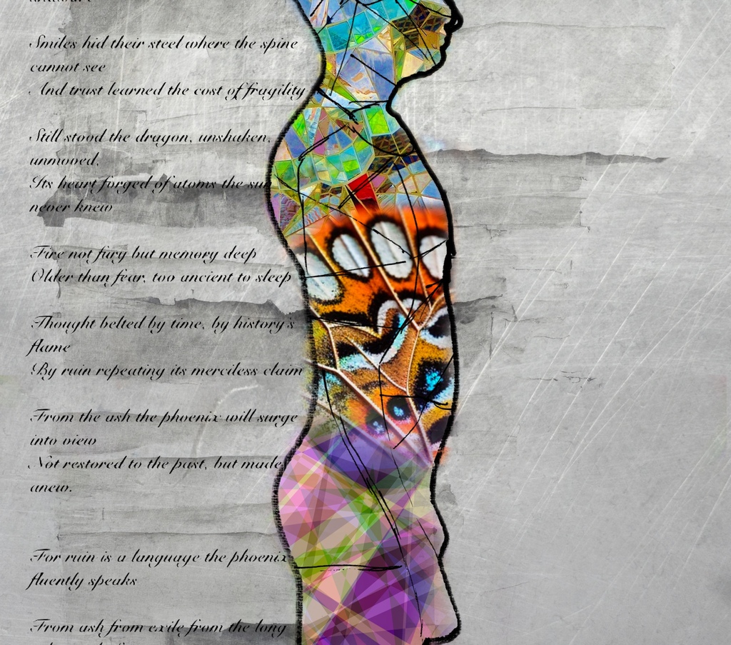 This work speaks to the rebirth of the soul through trial, rendered as a Kaleidoscope of crystal and colour with a homage to the metamorphoses of the butterfly rising from flame born of a dragon’s heart: incandescent, ancient, forged from dust older than the sun itself.