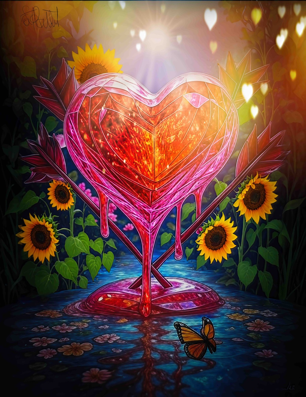 Shot through with arrows, it drips blood—a stark contrast to its jewel-like brilliance. The heart, much like that of a dragon—both rare and powerful—symbolizes the resilience of the soul, tempered by hardship, yet unbroken in its essential strength.